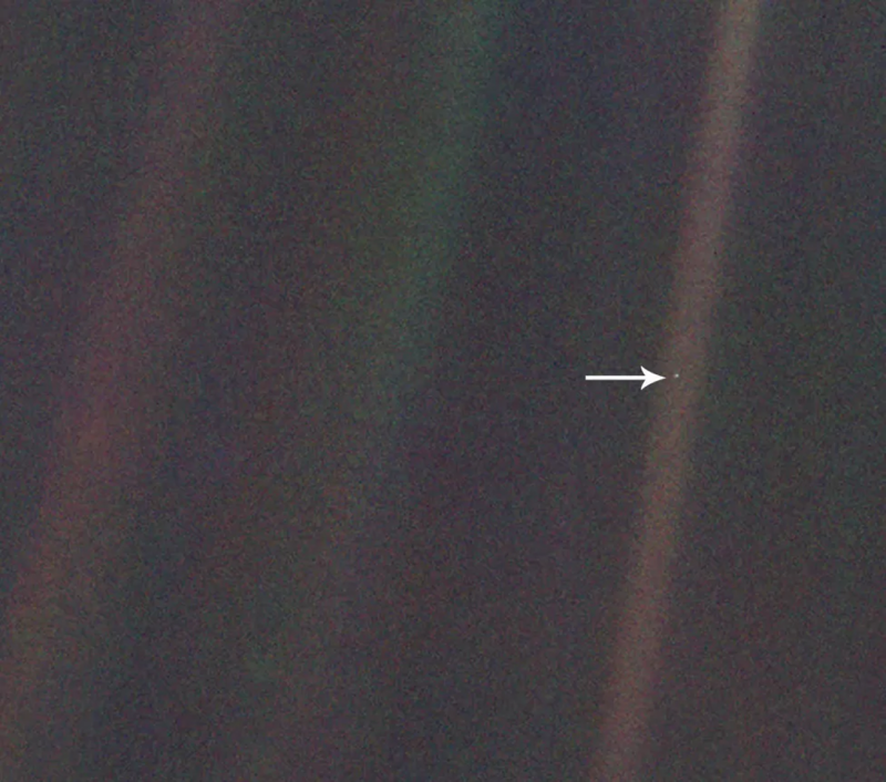 "Pale blue dot". Laatste foto van de Voyager 1 in 1990 terugkijkend op de Aarde van 6 miljard kilometers.